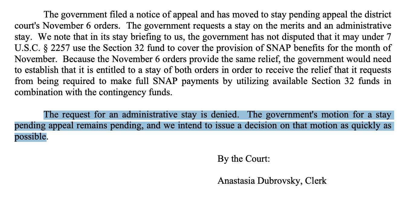 The plaintiffs went back to the district court later in the week, asking the Judge to enforce his earlier order because the government wasn’t in compliance with it. He agreed. The First Circuit Court of Appeals subsequently explained, “In a November 6 order, the district court granted the motion to enforce its October 31 order, concluding that the government had failed to either fully fund SNAP for November or to resolve administrative and clerical burdens such that partial payments would be made.” The court ordered the government to use the Section 32 funds by Friday to make full payments to SNAP recipients.