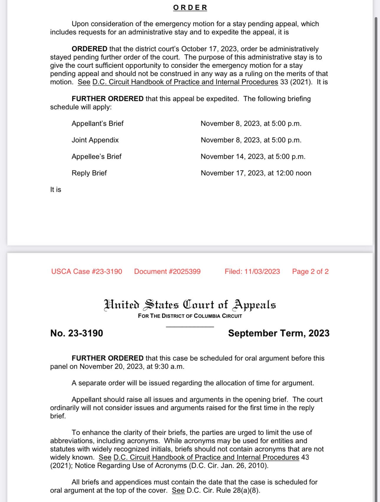 Some folks expressed alarm when this scheduling order came out, because of its provision that the gag order “be administratively stayed pending further order of the court.” But the administrative stay is akin to the one Judge Chutkan imposed for several days when Trump first challenged the gag order. It’s a limited effort to protect all parties’ rights, which doesn’t hint in any way at how they view the merits of the gag order, while the court takes a look at the stay issue. To grant a stay, the court must determine whether the party challenging a court’s order is likely to win on appeal, and so is entitled to preserve the status quo until that process is complete. The court will likely rule on Trump’s request for an emergency stay during the appeal Monday, or early this week.