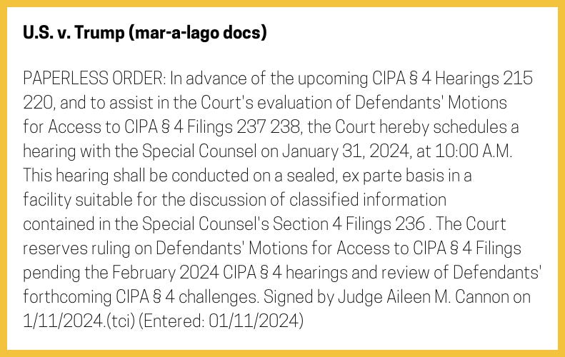 One of the biggest objections to Judge Cannon’s handling of the case has been the exceptional amount of delay she has indulged Trump with in what should have been a fairly straightforward case. That delay has been particularly troubling when it comes to CIPA. Instead of proceeding promptly to get to the point where she could rule on the Section 4 motions, she has permitted the matter to drag on. DOJ filed its Section 4 motions on December 6, and Trump and his co-defendants responded that same day. DOJ filed its opposition to their positions on December 20. Instead of scheduling a prompt hearing, Judge Cannon set it for eight weeks after DOJ filed its opposition. She offered no reason for allowing that amount of time to elapse—there was nothing on the calendar in this case that would have permitted her from doing it immediately. Now, we have this oddly scheduled ex-parte meeting on the calendar for this week.