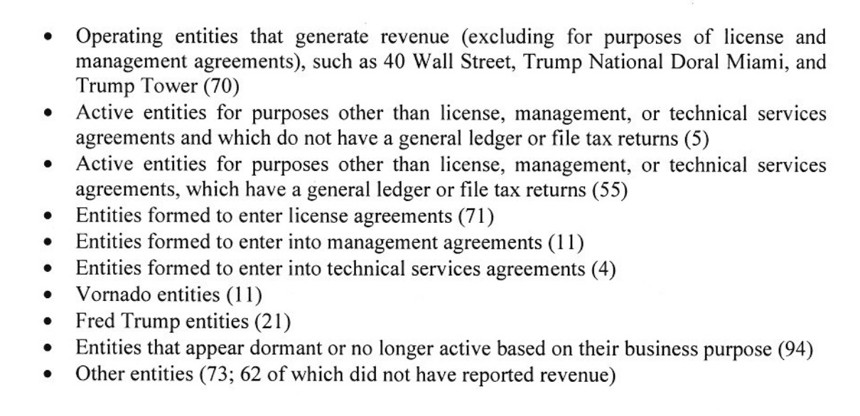 There is a lot of interesting information in the letter about the Trump Organization and the entities that exist within it—521 at the start of her monitorship, now reduced by 106 that have been dissolved. Jones described the functions of the remaining entities as follows: