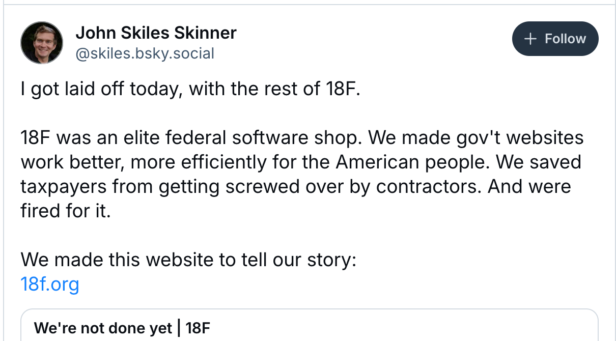 The laid-off workers explained their role, “For over 11 years, 18F has been proudly serving you to make government technology work better. We are non-partisan civil servants. 18F has worked on hundreds of projects, all designed to make government technology not just efficient but effective, and to save money for American taxpayers. However, all employees at 18F – a group that the Trump Administration GSA Technology Transformation Services Director called “the gold standard” of civic tech – were terminated today at midnight ET.”