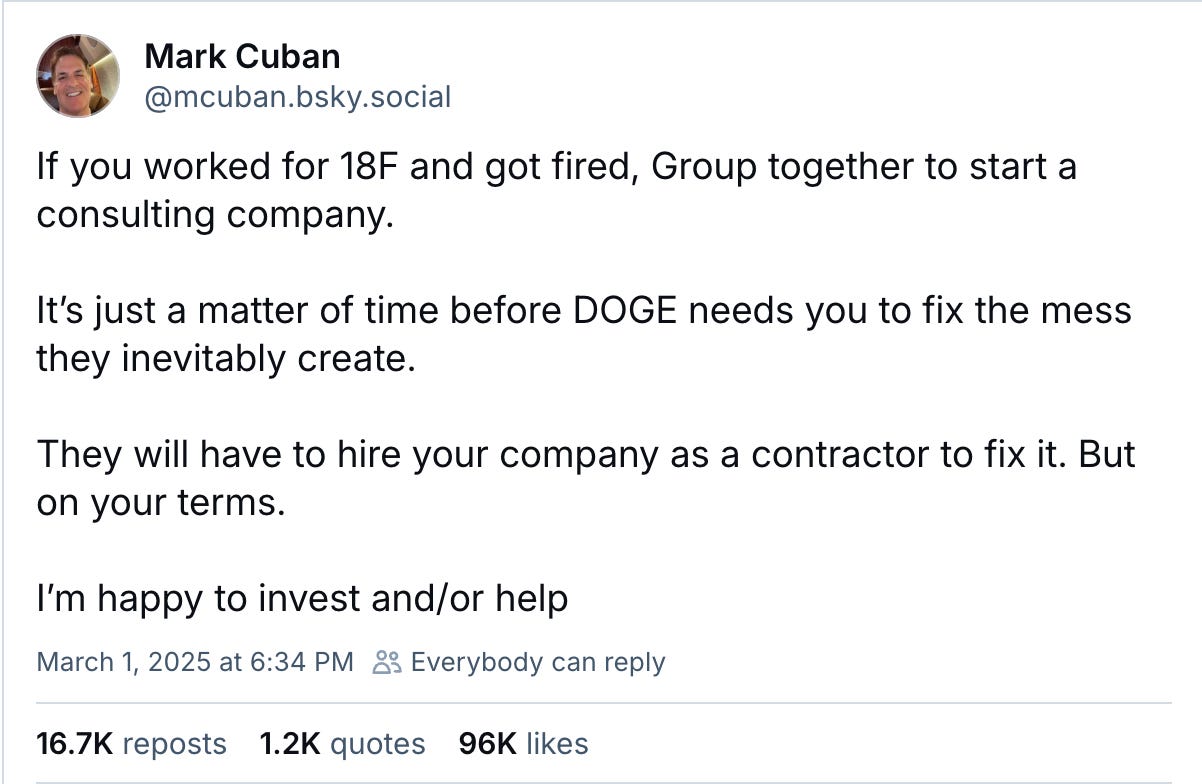 Mark Cuban subsequently posted that he would step in and help fired 18F employees form a private consulting firm.