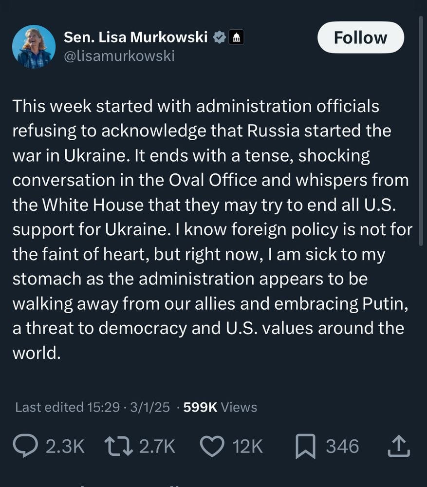 On Tuesday, Trump gives his first State of the Union address for his second term in office. He will assume the podium in front of a joint session of Congress with no credibility whatsoever. People who are being honest—that includes Republicans in the House and the Senate—understand how horribly he undermined the world order last week. He abandoned longtime allies in the process, not only Ukraine but NATO allies who now face an unpredictable future. Trump will offer his comments Tuesday after confirming the view of those who believed him to be Putin’s toady.