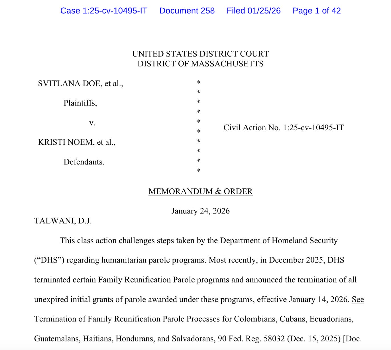 In Svitlana Doe v. Noem, Judge Indira Talwani entered an order we discussed on January 10 that prohibited the Trump administration from revoking parole granted to Colombians, Cubans, Ecuadorians, Guatemalans, Haitians, Hondurans, and Salvadorans with family reunification status for 14 days. It was a big loss for Trump.