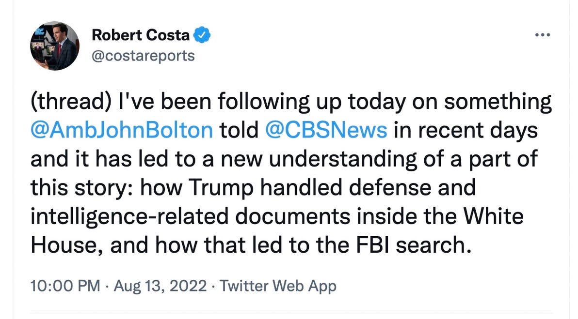 So, now we know DOJ believed, and a federal magistrate agreed, there is probable cause to believe three laws have been violated. The unsealed materials don’t identify the subjects/targets of the investigation, but it would defy belief if Trump isn’t somehow in that mix. Robert Costa has a very interesting thread on Twitter that discusses Trump asking for, and in some cases keeping, pieces of paper he wasn’t particularly interesting in reading during classified briefings. If accurate, it puts Trump squarely in the middle of events.