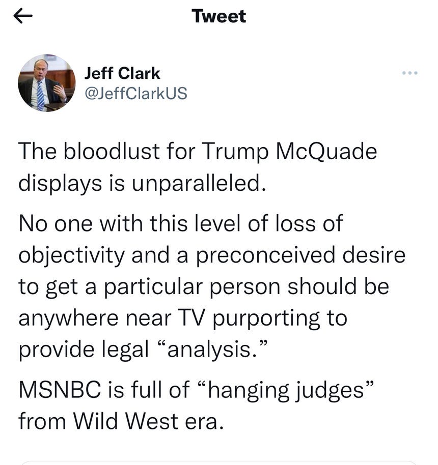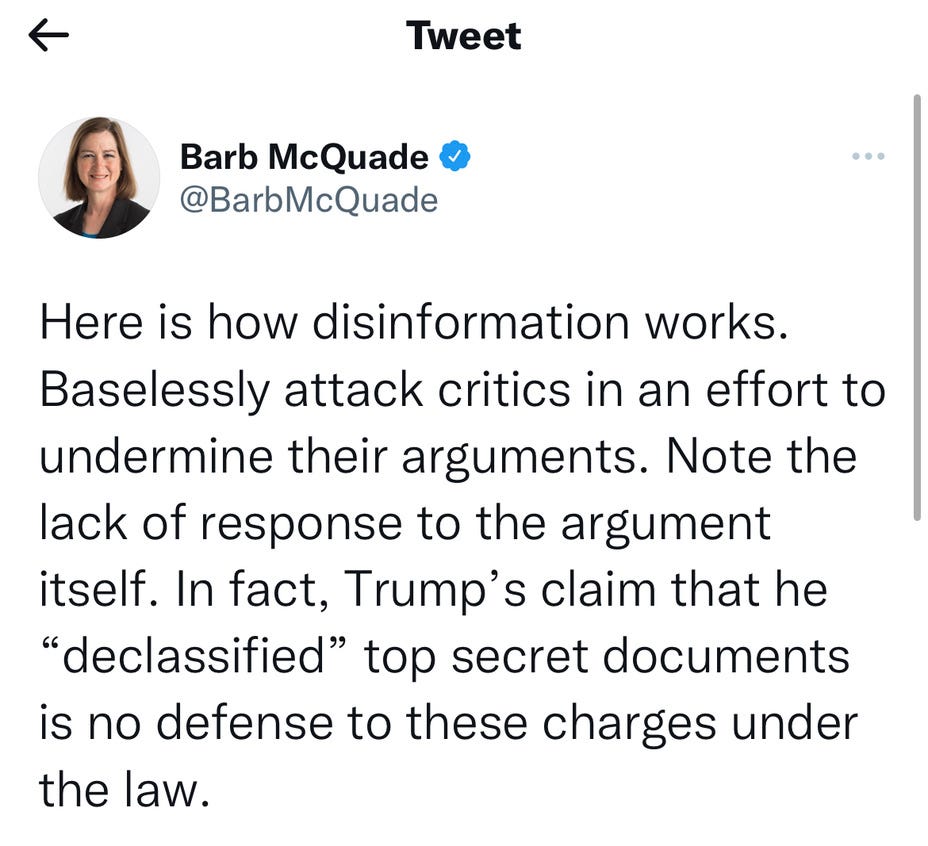 One more item before we close. The environmental lawyer who wanted to be attorney general is still trying to show off for Trump. He thought he could make up some inane nonsense about my #SistersInLaw podcast co-host and dear friend Barb McQuade, who tweeted an explanation of the classification issue we dove into up above. But Barb wasn’t having any of it and responded with one of the best examples of civil discourse I’ve seen; just the facts and no rancor.