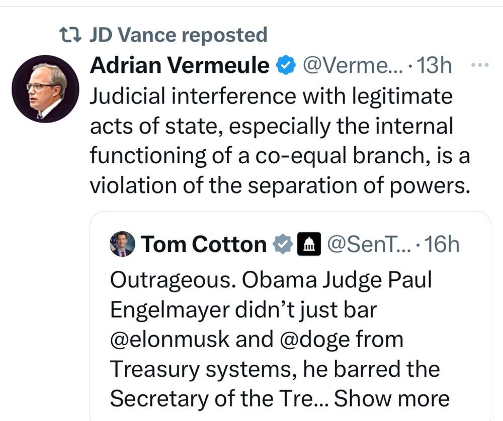Before we move onto the substantive issue, it’s worth noting the incredible hypocrisy here. Trump can delay the criminal justice system for years, but apparently a few days of delay to maintain the status quo while the court sorts things enough is now enough for Cotton and friends to suggest blowing up the judiciary instead of letting it fulfill its role in maintaining the balance among our three branches of government. Vice President, and Yale educated lawyer, JD Vance chimed in, retweeting the comments.