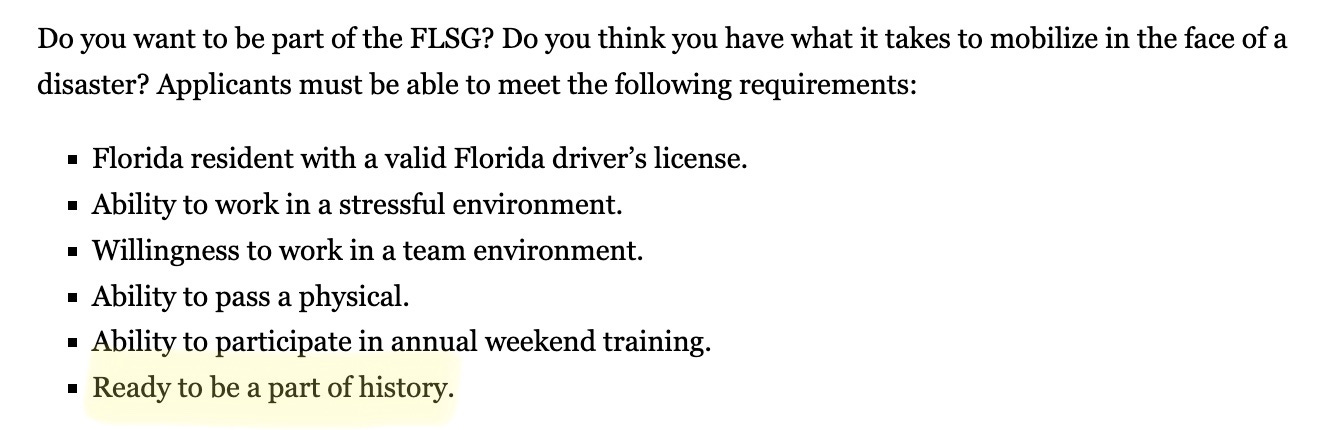 DeSantis issued a press release on June 30, celebrating the graduation of the first members of the State Guard: “Even though the federal government has underfunded our National Guard, we are ensuring that we have the manpower needed to respond during emergencies…When the need is greatest in their communities, these Guard members will be ready to answer the call.” He encouraged more people to apply, using the language below. The last “requirement,” “ready to be a part of history,” is perhaps just rank melodrama, but it feels ominous in context. Thanks but no thanks. Florida and America do not need a private Ron DeSantis army.