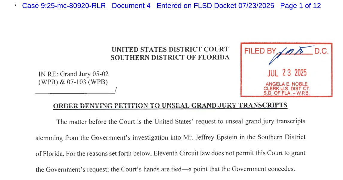 Trump’s ongoing effort to confuse his base about what’s in the Epstein files involves asking a federal judge to release just a limited bit of them, transcripts of grand jury testimony. Of course, we know that’s barely a sliver of what’s available and unlikely to be the pertinent parts people are interested in, since those transcripts will only involve witness testimony necessary to indict Epstein and Maxwell, not anyone else. It’s the other people that all the fuss is about.