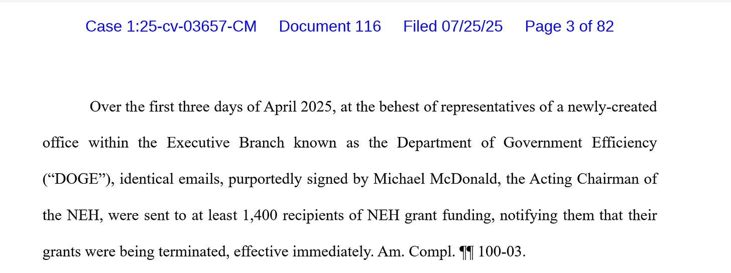 Friday night, in two cases, The Authors Guild v. National Endowment for the Humanities and American Council of Learned Societies, v. McDonald, a federal judge in the Southern District of New York blocked the cancellation of $175 million in National Endowment for the Humanities grants. DOGE terminated the grants in April. A lawsuit filed the following month challenged the terminations of grants to 1,400 recipients under provisions in various executive orders targeting diversity, equity, and inclusion (DEI) initiatives. The Judge ruled that the government had engaged in transparent viewpoint discrimination in violation of the First Amendment and granted a preliminary injunction against the terminations, but only for parties who had raised the First Amendment argument.