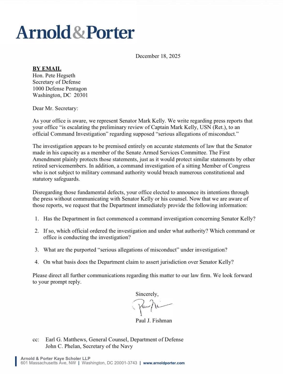 Mark Kelly’s lawyer, former New Jersey U.S. Attorney (Obama administration) Paul Fishman, wrote a letter on behalf of his client to “Secretary of War” Pete Hegseth. Apparently, Kelly is learning the details of the “escalating” investigation into him—Fishman calls it “unprecedented and dangerous overreach” in the letter—in the press. Contacting the lawyer seems to have gone out of vogue. The investigation into Kelly stems from the video he and other members made to remind service members they did not have to follow illegal orders. We discussed it here.