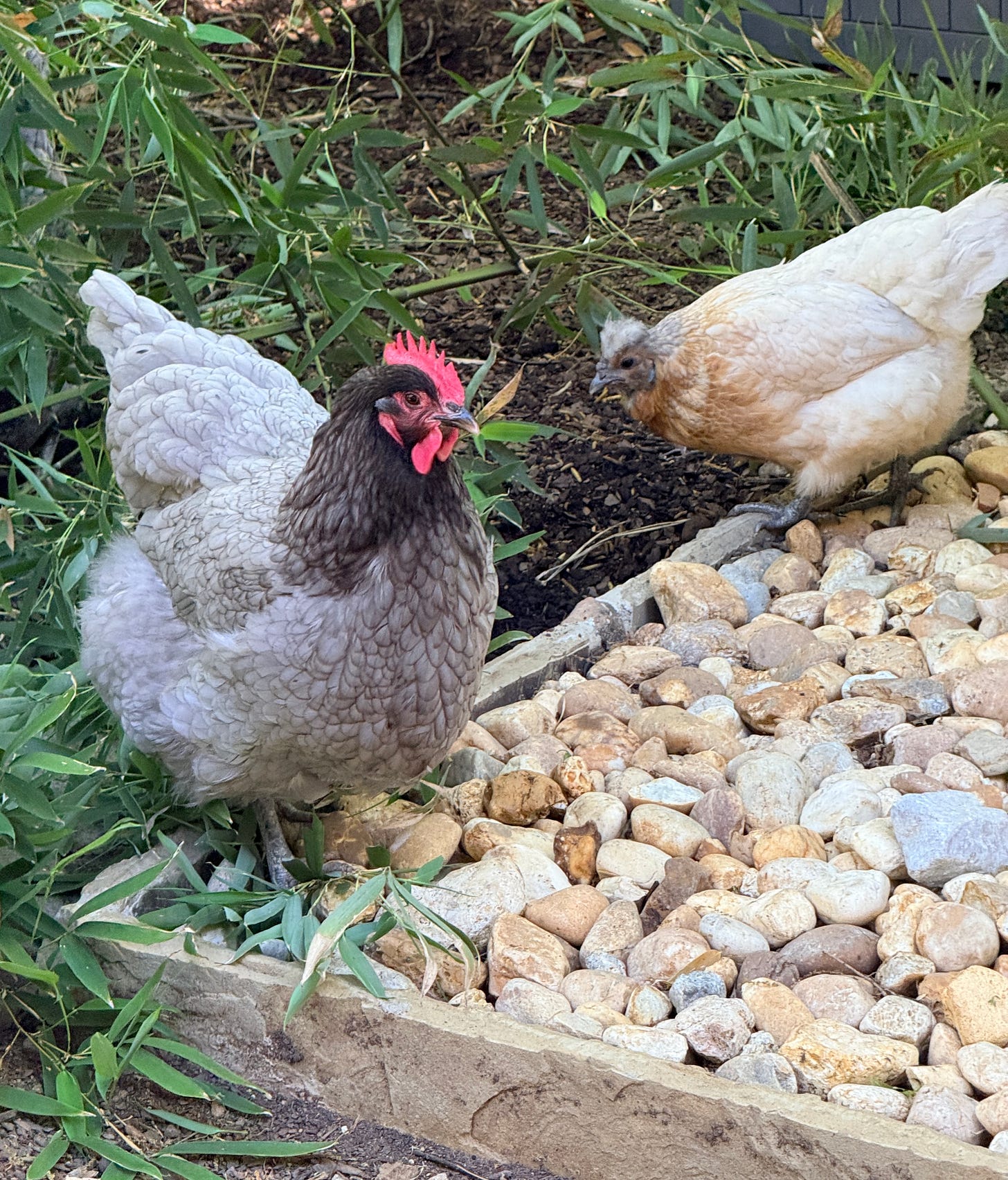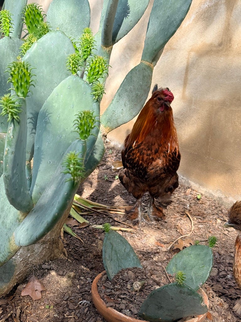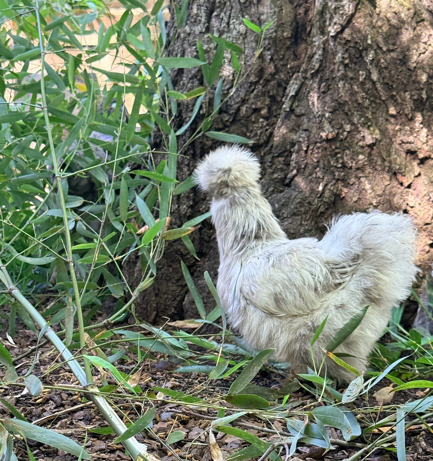 Today is the start of the annual bamboo feast, where we cut down some of the tender young shoots and let the girls go to town. It’s high in protein and always seems to help the last feathers grow back in at the end of their molt. I’m ready for my fluffy girls again, after watching them try to grow out some very bedraggled-looking feathers these last few weeks.