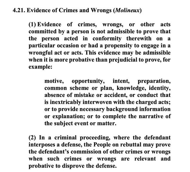 He will make a number of these rulings about admissibility of evidence in advance of trial. Others may come up while the case is underway. Note that under the rule below, 4.21(2), a defendant can “open the door” to evidence prosecutors might not otherwise be able to use by making certain arguments. If Trump, for instance, continues to deny having had affairs with witnesses Stormy Daniels and Karen McDougal, things could get interesting.