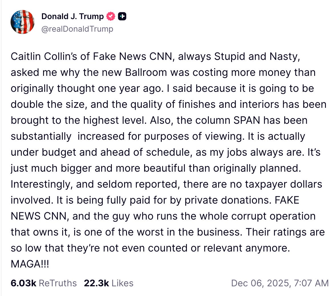 On Saturday, Trump called CNN’s Kaitlan Collins “stupid and nasty” on Truth Social because she had the temerity to question him about cost overruns with his ridiculous White House ballroom project. In other words, the president of the United States heaped unmerited criticism on a female journalist for simply trying to do her job.