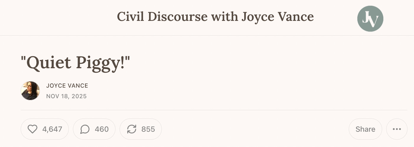 When we discussed the “Quiet, Piggy!” incident, I wrote: “It tells you all you need to know about this president’s attitude toward women. Of course, that hasn’t been in doubt since we saw him on tape saying, ‘Grab them by the p*ssy.’ He’s called a stream of women who stood up to him, like Hillary Clinton, Nancy Pelosi, and Kamala Harris, ‘nasty women.’ In 2014, Trump called New York Times columnist Gail Collins ‘frumpy and very dumb.’ We could be here all night listing the misogyny, but the sad truth is, MAGA doesn’t care. The men like it and the women, inexplicably, are willing to tolerate it.”