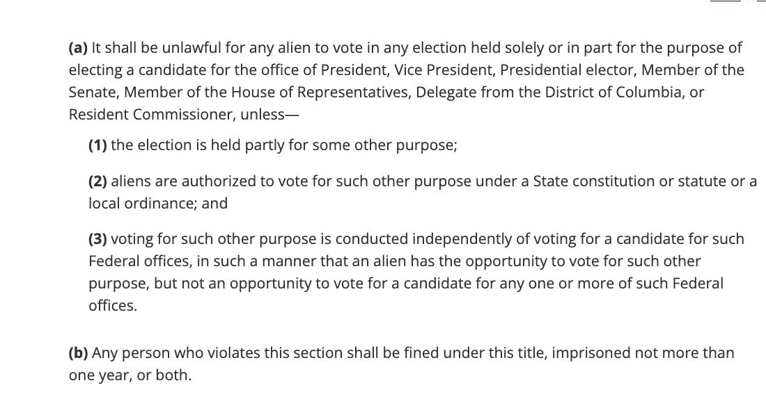 Noncitizens can’t just walk across the border and register to vote, which seems to be Trump’s theme here. It’s a federal crime for noncitizens to vote in a presidential election, prohibited by Title 18 of the U.S. Code, Section 611.