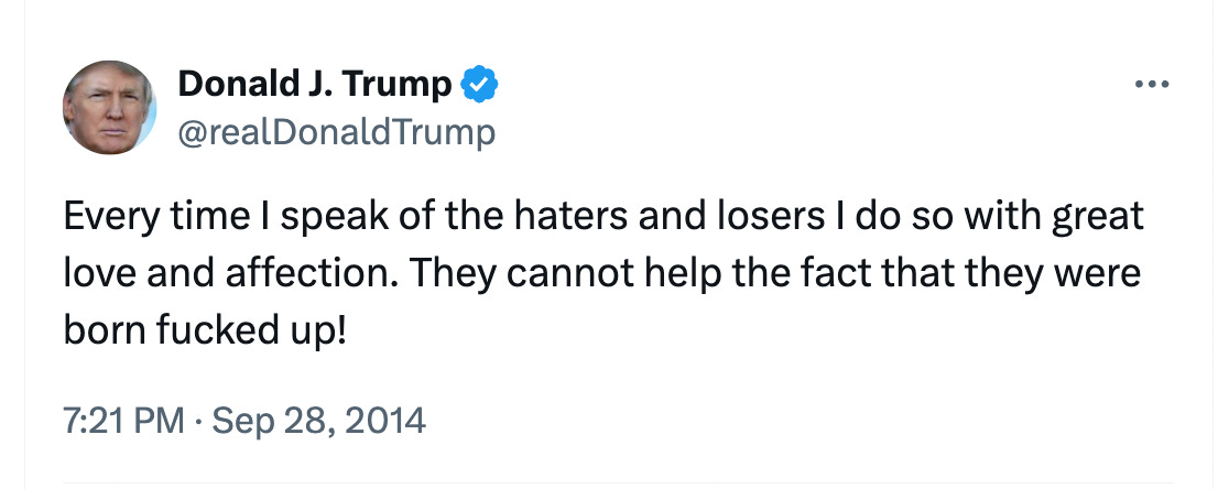 Donald Trump is at the Alabama-Georgia game tonight. I’m not celebrating that appearance, but I am here to remind everyone of the 10-year anniversary of this Trump Tweet from September 28, 2014. Everything we needed to know about him was apparent two years before the 2016 election, and yet, here we are.