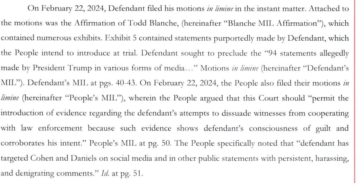 This afternoon, Judge Merchan denied Trump’s motion to exclude evidence, like his “presidential tweets” about the case, because, in Trump’s convoluted universe, anything he tweeted or said while in office is cloaked in presidential immunity. Trump always says the quiet part out loud, and in this case, he discussed everything the payments Michael Cohen made to the character of the witnesses and their veracity.