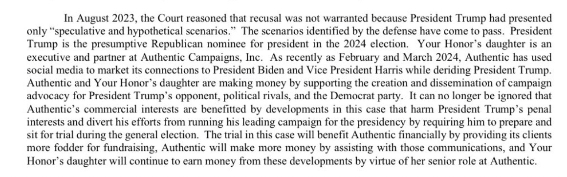Of course, Judge Merchan did what good judges do when a motion alleging they have a conflict is filed. When the first motion was filed, he sought an ethics opinion on whether he had a conflict of interest that required him to step aside. The ethics panel concluded he did not because the outcome of the case wouldn’t impact his daughter’s business. The best Trump’s lawyers can argue is that the Judge’s daughter does business with some of his opponents. You can read their unsuccessful effort at linking the prosecution of Trump to her business prospects in the paragraph above. It’s pretty weak sauce, akin to arguing that if a judge’s kid does business with Airbus, the judge can’t sit on a case involving Boeing. That’s not the standard being used here—it’s whether decisions the Judge makes will impact his daughter’s financial prospects. Here, whether Trump wins or loses, the daughter continues to do her work on behalf of her Democratic clients. The fact that she’s in politics, so to speak, isn’t the defining standard.