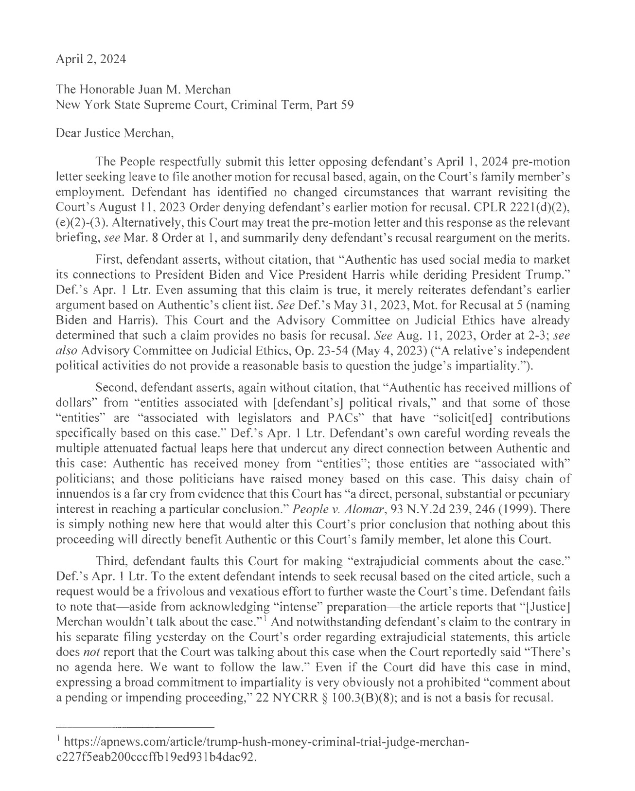 Trump’s lawyers also claim the Judge has made public statements about the case, but the DA points out they failed to acknowledge he actually declined to comment on any specifics of case, while saying a great deal of work and “intense preparation” has to take place ahead of trial. The DA concludes that, "This daisy chain of innuendos is a far cry from evidence that this Court has 'a direct, personal, substantial or pecuniary interest in reaching a particular conclusion,’” quoting controlling New York caselaw on conflicts of interest.