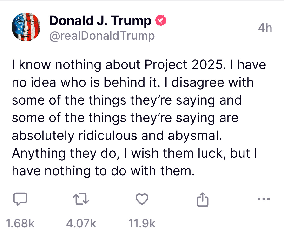 I posted on FB that his disavowal is the FIRST indicator that news about Project 2025 is starting to get people's attention.