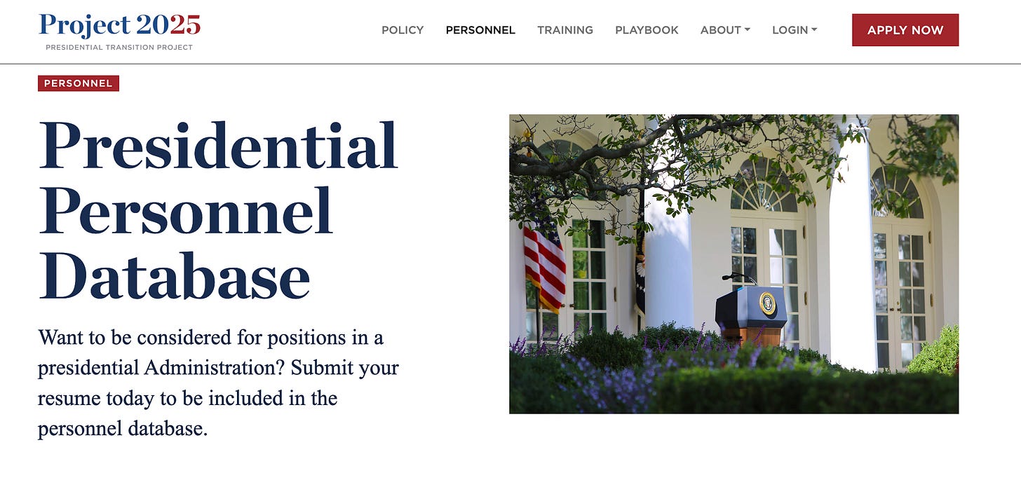 Or, like Spencer Chretien, the Associate Director of Heritage’s 2025 Presidential Transition Project. Chretien’s Heritage Foundation bio relates that “From 2020-2021, Chretien was a Special Assistant to President Donald J. Trump and Associate Director of Presidential Personnel, helping to identify, recruit, and place hundreds of political appointees at all levels of government.” That makes it doubly interesting that one of the functions the Project 2025 website serves is to accept applications from people interested in political appointments in the next administration, the “Plum Book” positions that Heritage encourages interested people to peruse and apply for.