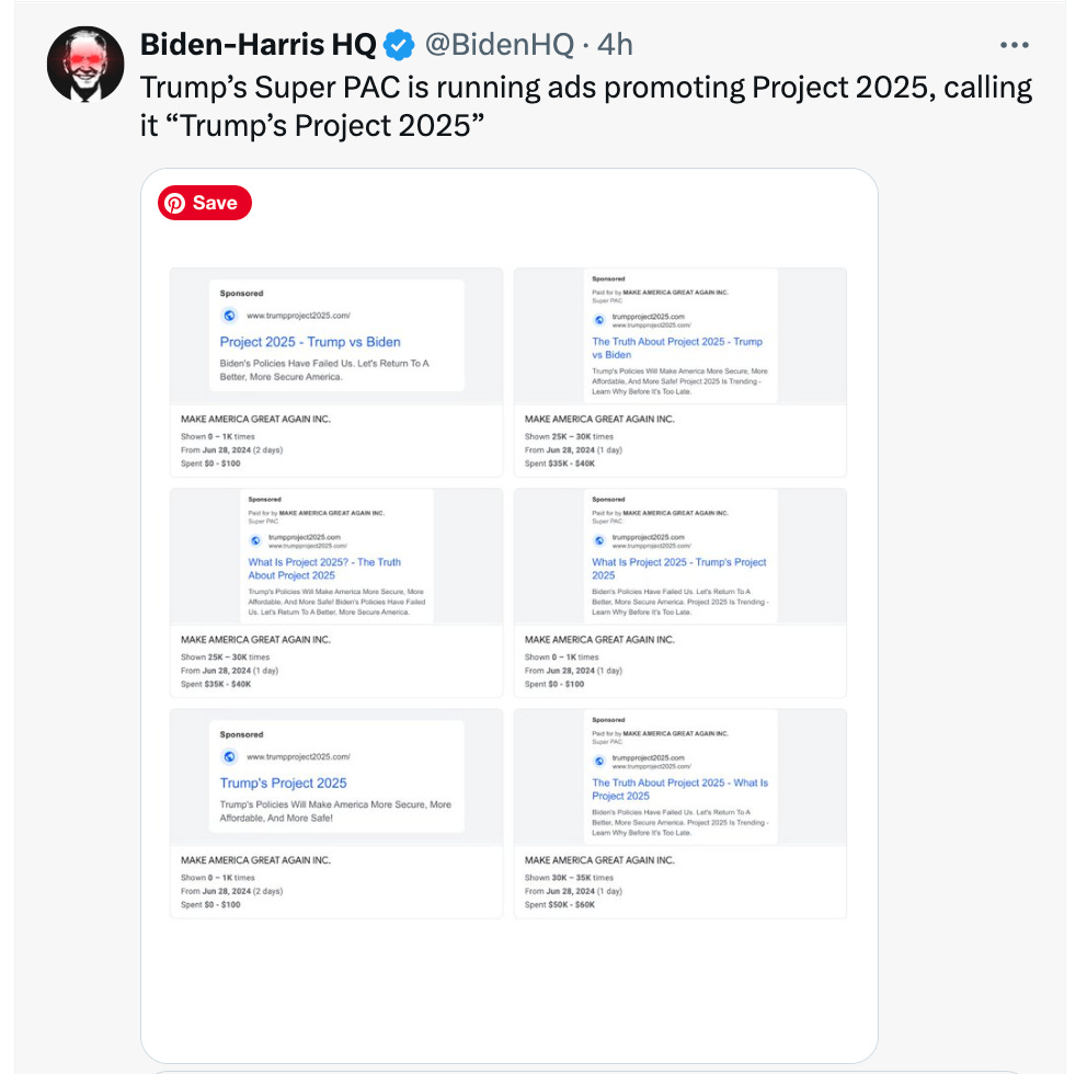 The horse race polls may not have been the only polling data Trump looked at, because after devoting his 11 a.m. hour to them, he posted on Truth Social that he isn’t connected to Project 2025. It was almost as though he’d seen something suggesting that the plan, which we’ve been discussing here at Civil Discourse, isn’t particularly popular with voters who are informed about it. As Rick Wilson tweeted, it’s about as popular as Ebola.