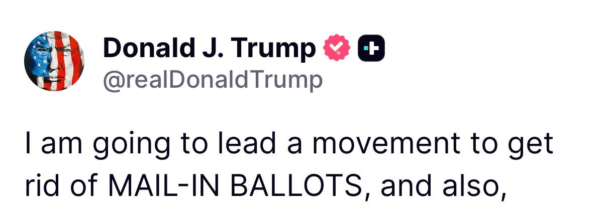 Early this morning, Trump was on Truth Social. His post (he calls them “truths”) was yet another screed about voter fraud and ending mail-in voting—something that’s up to every state, and not the president.