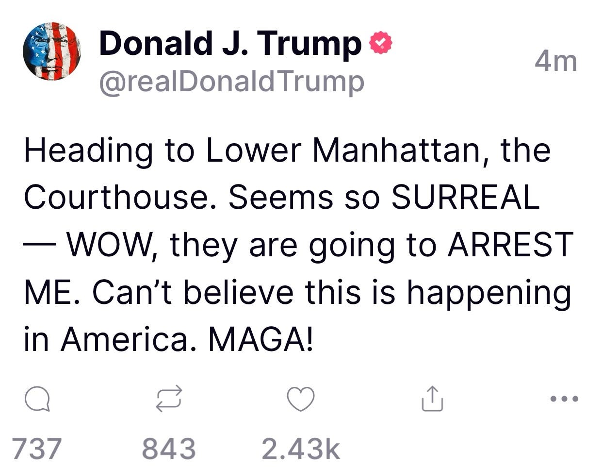 The indictment charges 34 felony counts of business records fraud. Read it here. That’s the charge we previewed in last night’s newsletter, so if you want a refresher on what it involves, re-read here.