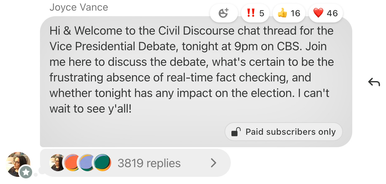 At the end of the debate, the issue is: Will it move the needle in any way? The answer is, not likely. The kind of folks who self-selected to watch it are largely already decided. This was the kind of traditional debate that is more likely to lock voters into their preconceived picks than to change their minds. Perhaps the awkward, painful minute where Vance tried to mansplain the moderators, repeatedly talking over them as they tried to limit him to the time he was allotted by the rules, might have some impact. What mattered so much to Vance? He wanted to lie some more about immigrants in Ohio.