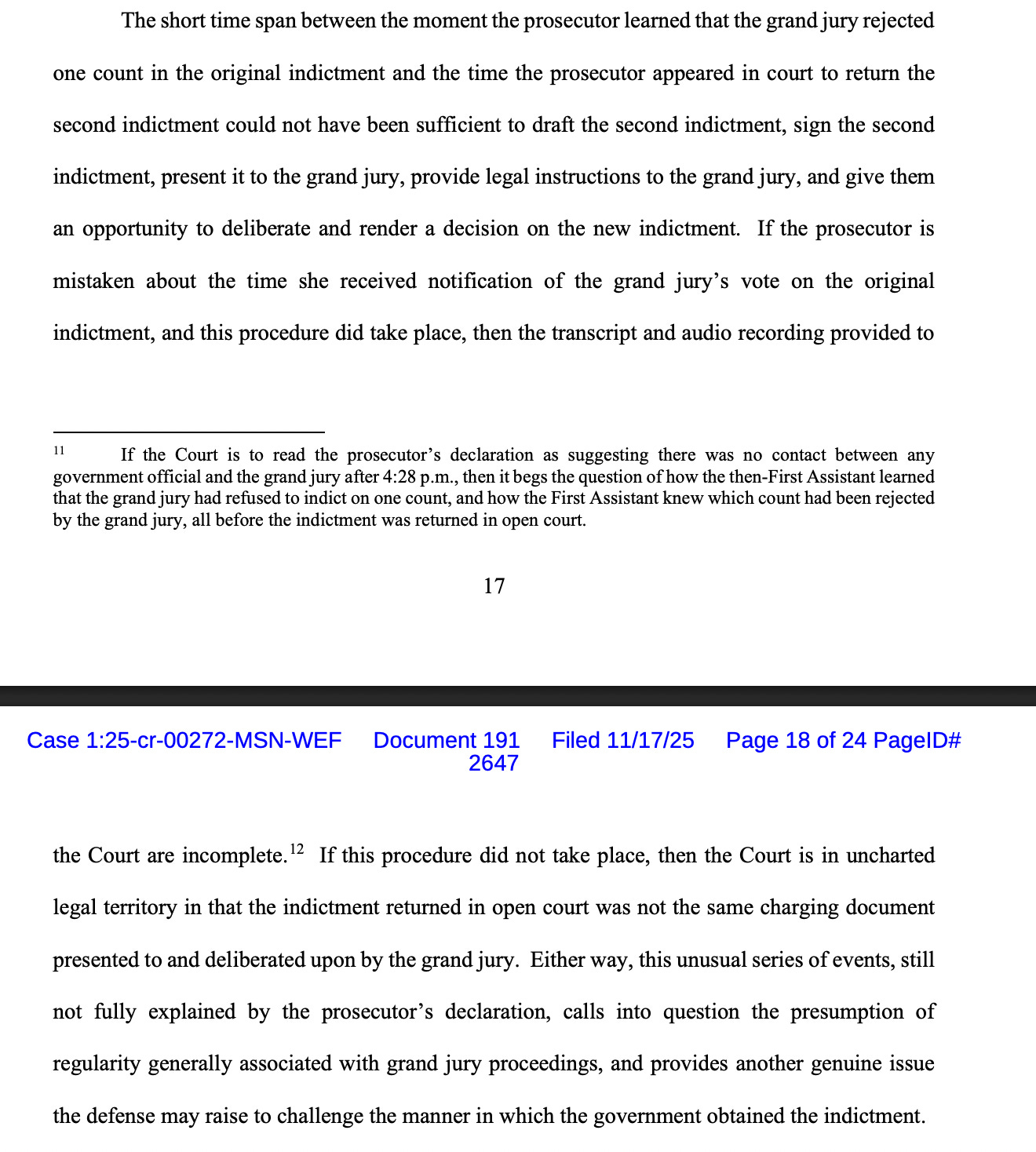 Whether Comey will ultimately get access to the grand jury materials is now up to Judge Nachmanoff. The larger issue that looms is whether this situation (independent of the motions for selective and vindictive prosecution we have previously discussed, along with one regarding the propriety of Halligan’s appointment as U.S. Attorney) will provide a basis for dismissal of the indictment. Judge Fitzpatrick suggested that it might: “The Supreme Court has recognized that a district court may use its supervisory power ‘to dismiss an indictment because of misconduct before the grand jury’ … The Supreme Court has also recognized that this supervisory power of federal district courts should be used ‘to implement a remedy for violation[s] of recognized rights, to preserve judicial integrity by ensuring that a conviction rests on appropriate considerations validly before the jury, and finally, as a remedy designed to deter illegal conduct.’” He concluded, “Accordingly, when prosecutorial misconduct before the grand jury prejudices a defendant and threatens the defendant’s right to fundamental fairness in the criminal process, a district court may exercise its supervisory authority to dismiss the indictment.”