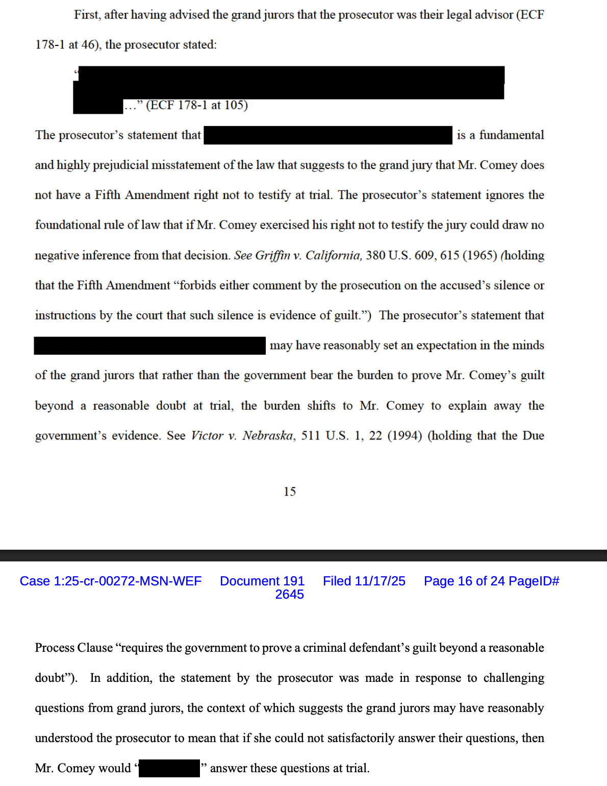 To understand what happened today, we need to know how we got here. The government wanted to use evidence from another proceeding in this case, but some of that evidence was protected by the attorney-client privilege. The government asked the Judge to permit them to use a “filter team” to evaluate the evidence to decide what the prosecutors in this case could use without violating the privilege. There are two judges involved: District Judge Michael Nachmanoff, who is hearing the case, and Magistrate Judge William Fitzpatrick, who is hearing some of the discovery disputes. In the course of the proceedings before Magistrate Judge Fitzpatrick, problems came to light involving Halligan’s presentation to the grand jury and Comey’s lawyers filed a motion asking for disclosure of the grand jury minutes, in part because “the agent who served as a witness in the proceedings may have been exposed to Mr. Comey’s privileged communications with his attorneys and thus may have conveyed that information to the grand jury.” (If you want to know more about the filter team dispute after you’ve read tonight’s post, the dense procedural history of the case is laid out here).