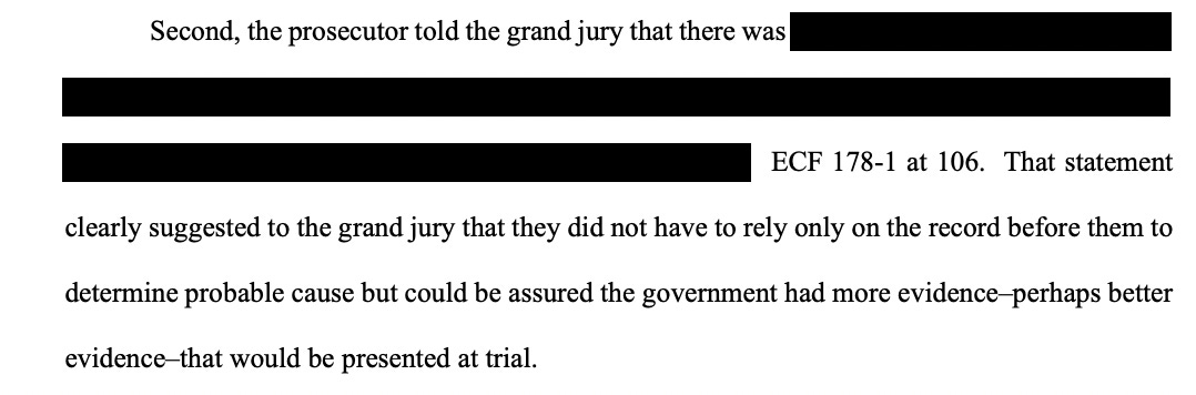 Halligan also made a statement to the grand jury, which is redacted in the order, but suggested that the grand jurors could “be assured the government has more evidence, perhaps better evidence,” than what it presented to the grand jury and that it could offer at trial. That is staggeringly wrong and so completely violates fundamental legal rules that it should deliver a fatal blow to the indictment if the redacted portion of the paragraph bears out the conclusion the Judge reached.