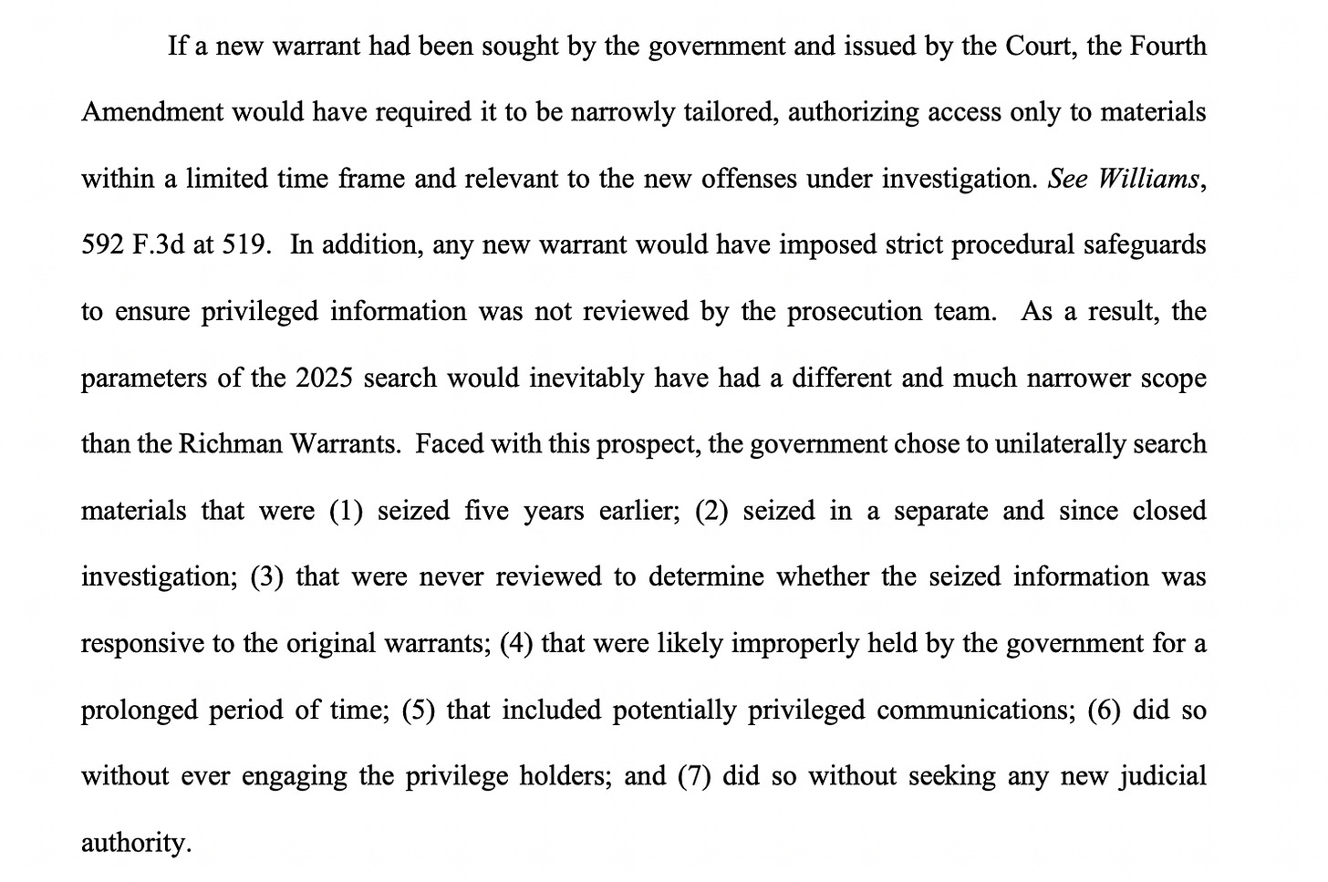 The order traces the history of the “other investigation”—the one prosecutors in the Eastern District of Virginia apparently wanted to use in the Comey case, and which led to the filter team proceedings. It was called Arctic Haze and took place back in 2019 and 2020. It involved Comey’s friend Daniel Richman, whom Comey hired as one of his lawyers after Trump fired him, and allegations that government property in the form of classified information was stolen and then provided to journalists by Richman. It turns out that the Judge found evidence that the government violated the attorney-client privilege when it executed search warrants in that case, and that the government violated a fundamental requirement of the Fourth Amendment, that agents executing a search warrant only seize materials that the warrant authorizes them to take away. That case did not result in any indictments, and the search warrants were never tested in court.