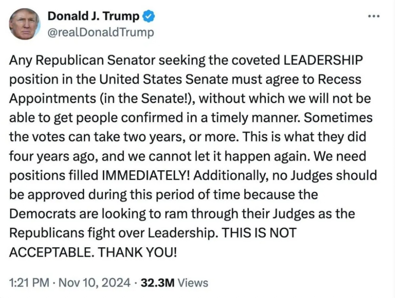Post-election Trump is making it clear that he meant what he said during the campaign, whether it’s mass deportations, Project 2025, or completely rolling back preparations for climate change. And democracy is at stake. Instead of rolling over at Trump’s first run at them and permitting him to bypass the Constitutional command that they confirm his appointees, Senate Republicans should stand their ground, or they may find in the future that they have no ground left to stand on.