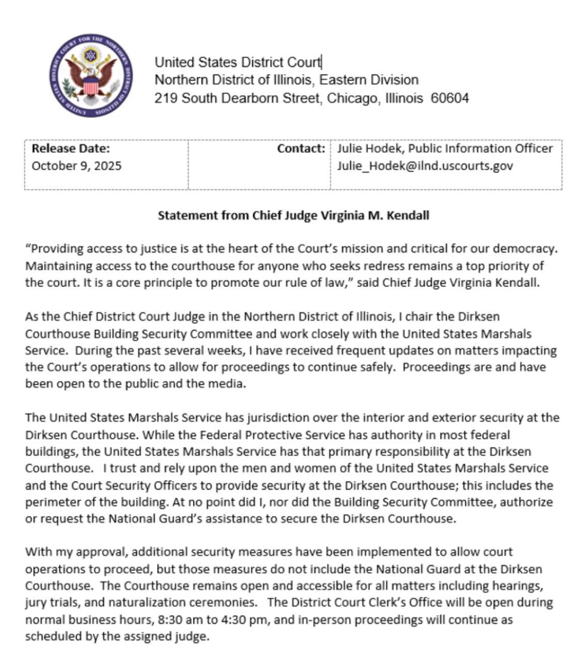 Some Judges have other ideas. In Chicago, the Chief Judge for the Northern District of Illinois, Virginia Kendall, made it clear that her courthouse does not need National Guard troops to protect it, saying, “At no point did I, nor the Building Security Committee, authorize or request the National Guard’s assistance to secure the Dirksen Courthouse.” Judge Kendall, who was appointed by George W. Bush in 2006, noted that the security of the courthouse is under the jurisdiction of the U.S. Marshals Service and that she “trust[s] and rel[ies] upon the men and women of the United States Marshals Service and the Court Security Officers to provide security at the Dirksen Courthouse.” That can’t be welcome news for an administration that has to establish it is “unable with the regular forces to execute the laws of the United States” and protect federal property, in order to justify calling up National Guard troops.