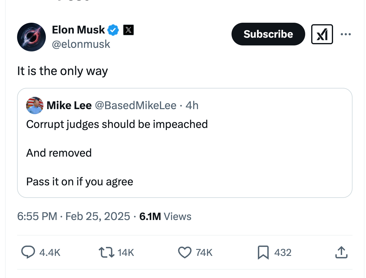 And isn’t that what this is really about? The judiciary is one of the few democratic institutions left that can interfere with the plan to place all the reins of power in the hands of the president. So when Mike Lee calls for judges to be impeached and Elon Musk responds that “it is the only way,” we know where this is headed.