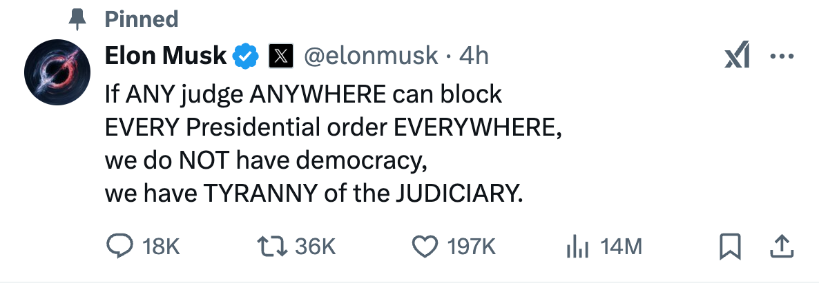 But that’s where we are. Elon Musk, lacking the finesse of Lee, simply calls for judges to be fired, ignoring the fact that they have life tenure.