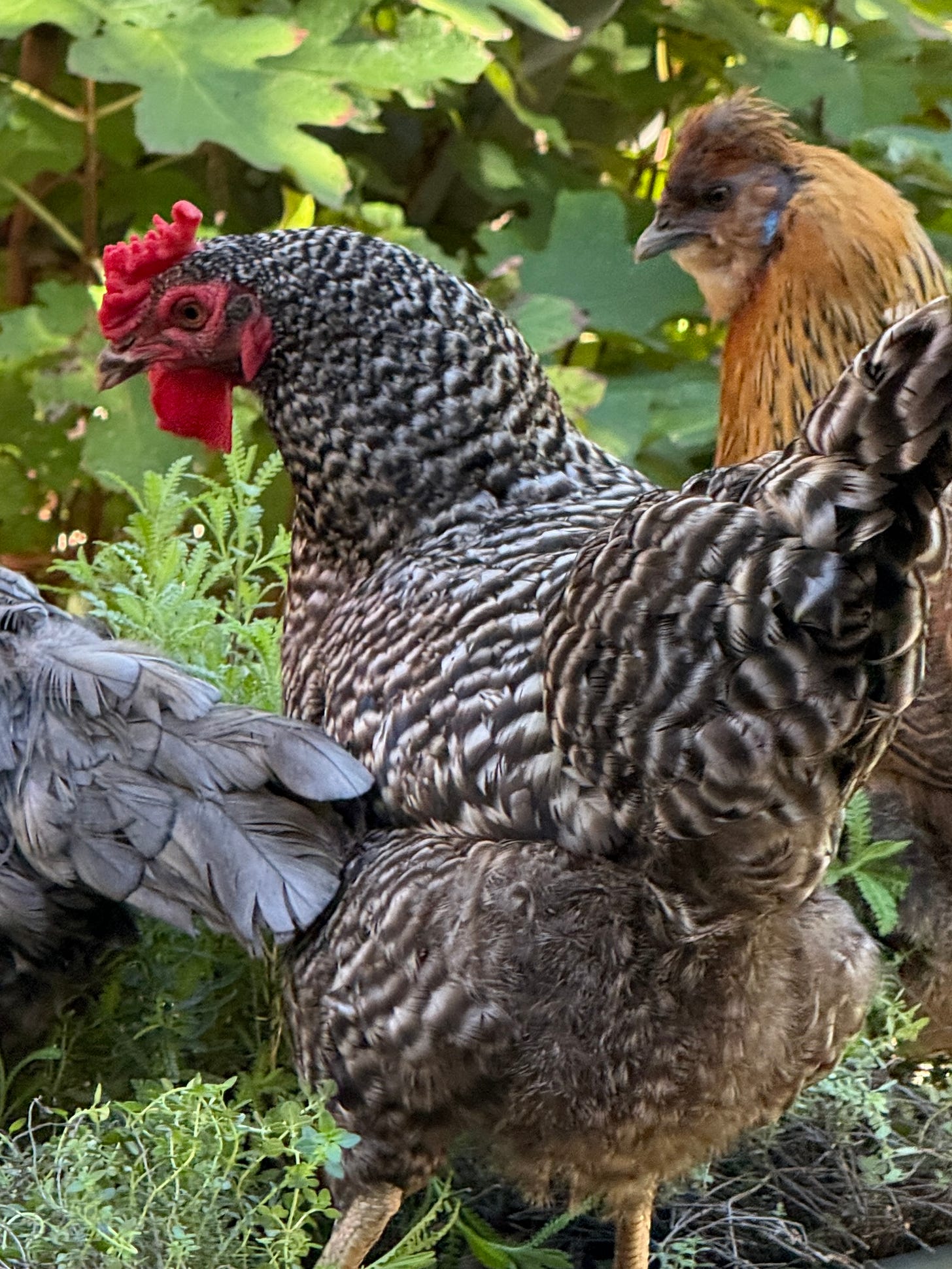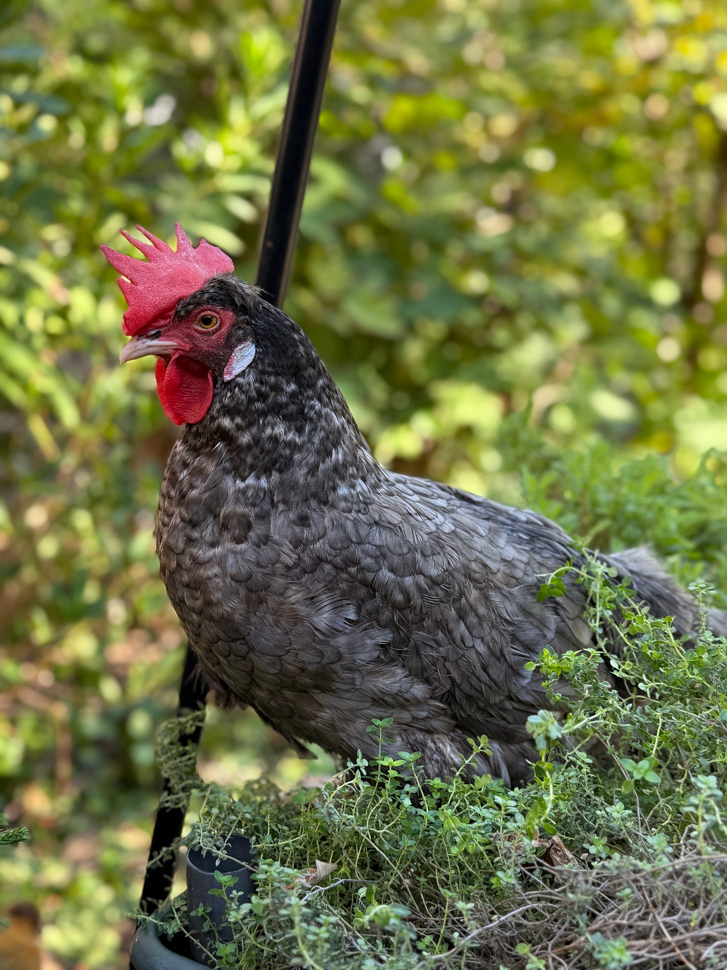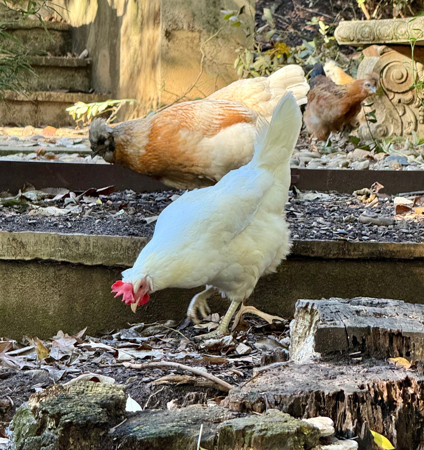 These two didn’t make it into the planter, but they’re too pretty not to share with you (that’s Clementine in back, named for my law school roommate’s beloved Samoyed, and Toot in front.) And that’s Red who you can sort of see off to the right, one of the two new chicks Esther hatched, and who, because I haven’t been creative at all lately, have become known as Red and White based on their colors.
